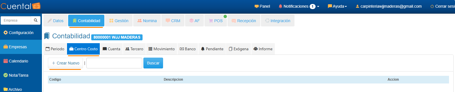 2. Ingresa a la pestaña Centro Costo y haz clic en Crear Nuevo