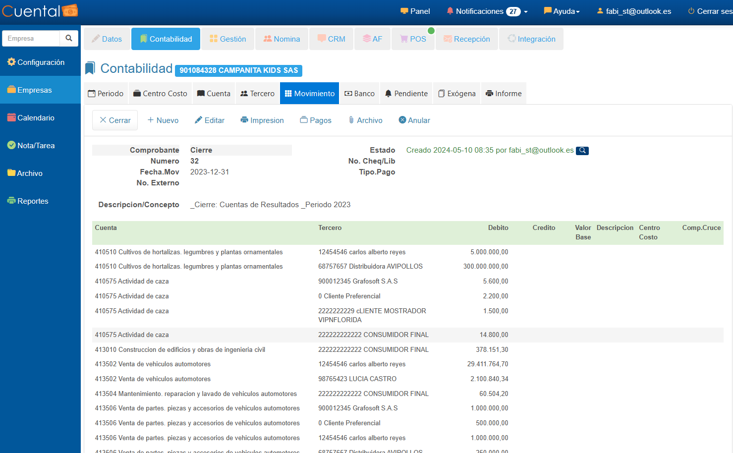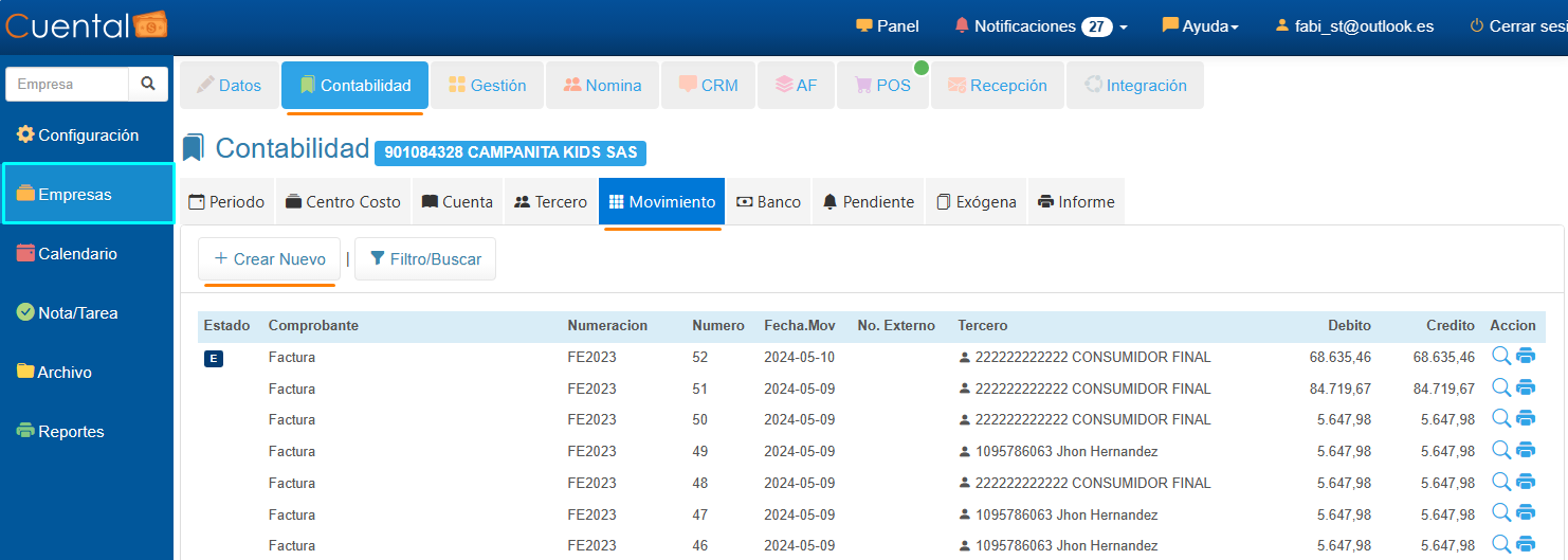 1. Selecciona la Empresa en la que vas a realizar el Movimiento. Ver aquí 2. En la sección Contabilidad/Movimiento, haz clic en Crear Nuevo.