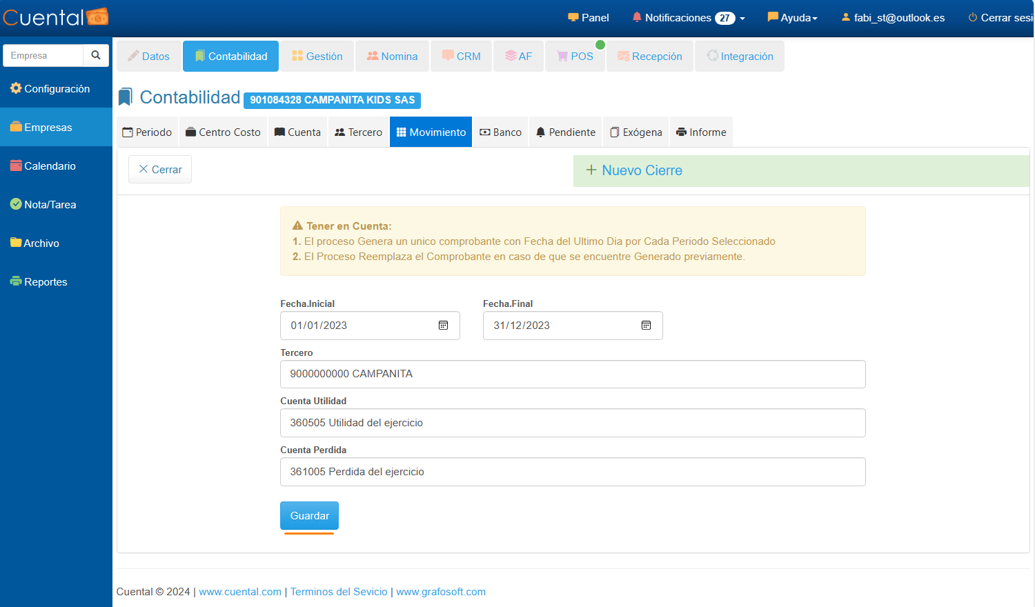 4. Diligencia el respectivo formulario, ingresando Tercero, Cuenta.Utilidad, Cuenta.Perdida. Al finalizar haz clic en el botón Guardar. * El tercero para este caso de Cierre, corresponde a la Empresa Propia.