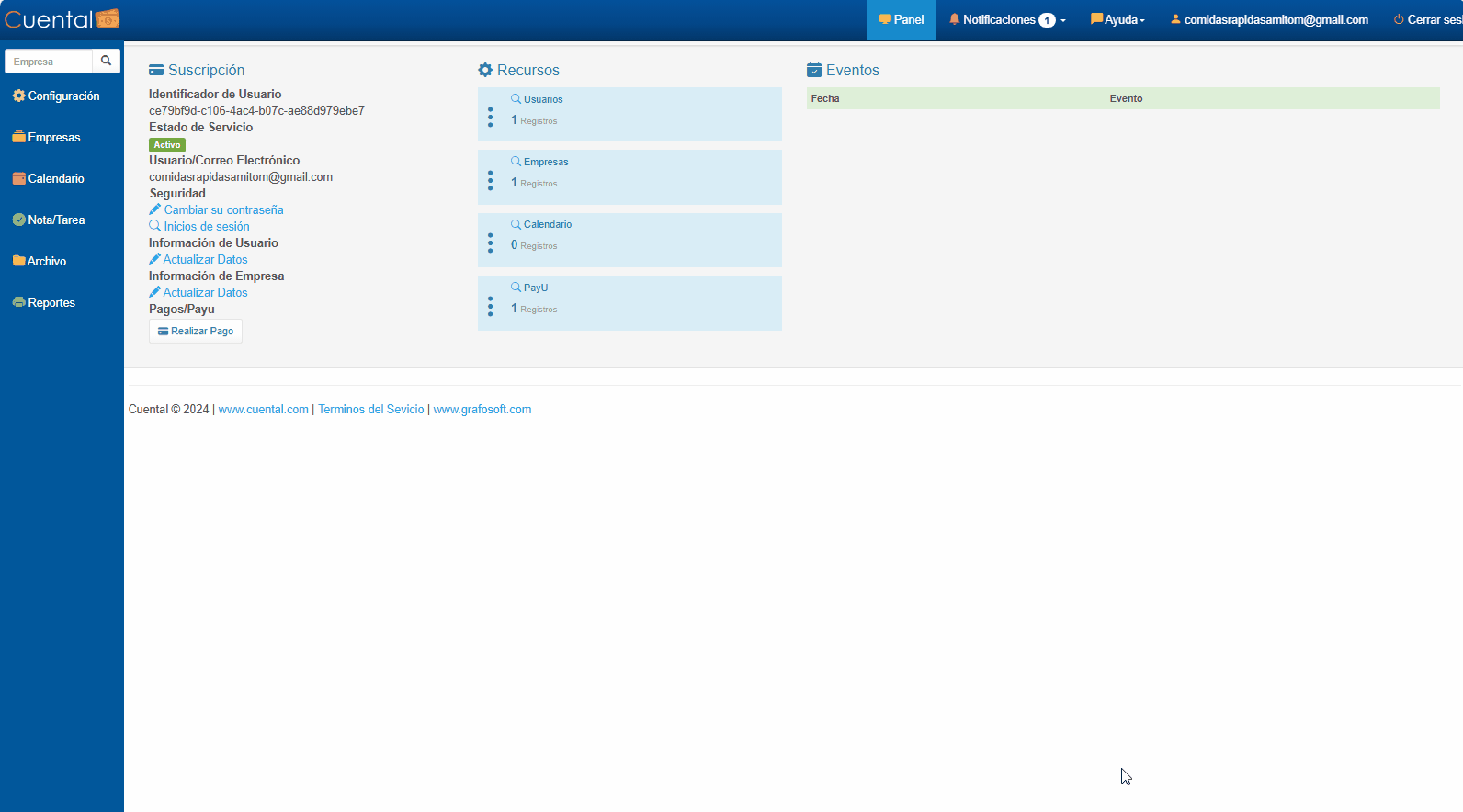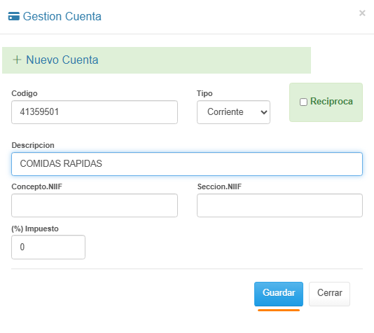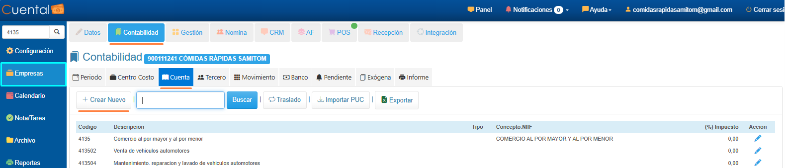 En la sección Cuenta puedes Crear, Consultar, modificar y/o Eliminar Cuentas, subcuentas, auxiliares y subauxiliares contables de Interés para la Empresa. |