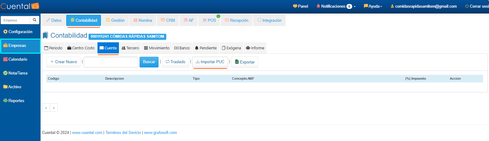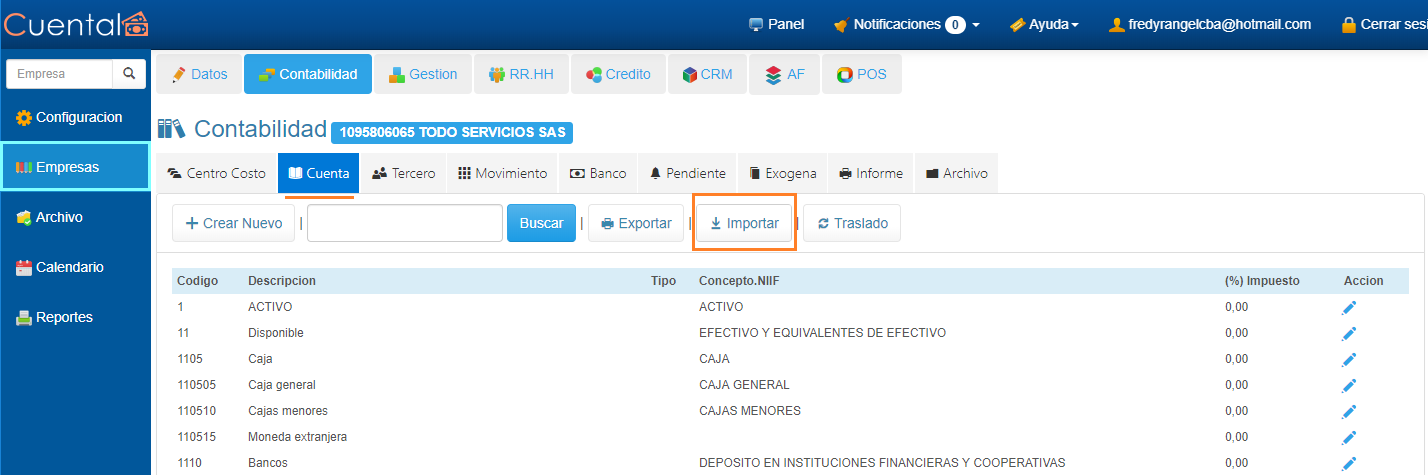 1. En la opción Cuenta en el menú horizontal de Contabilidad ubicado en cada Empresa, haz clic en el botón Importar.