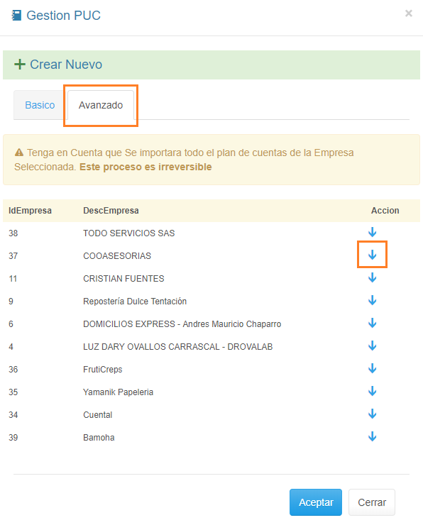2. Haz clic sobre el icono de descarga ubicado en el registro de la empresa que deseas importar el PUC.