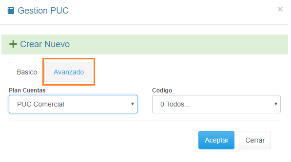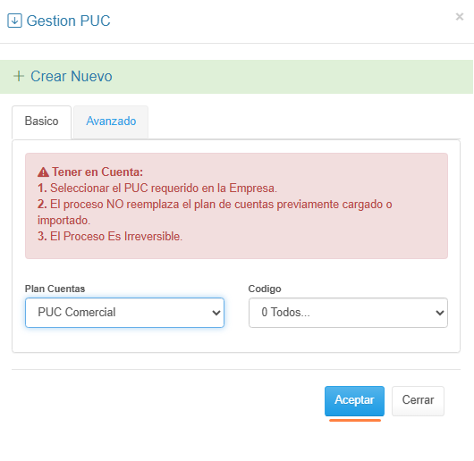 2. Diligencia el formulario seleccionando el Plan de Cuentas (PUC COMERCIAL Y PUC SALUD) y las Cuentas Contables a importar .