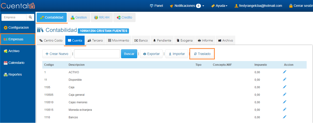 1. En la opción Cuenta en el menú horizontal de Contabilidad ubicado en cada Empresa, haz clic en el botón Traslado.