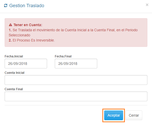 2. Diligencia el formato y haz clic en el botón Aceptar. Cuenta Inicial: Cuenta de donde se inicia el traslado de movimientos. Cuenta final: Cuenta Destino de movimientos.