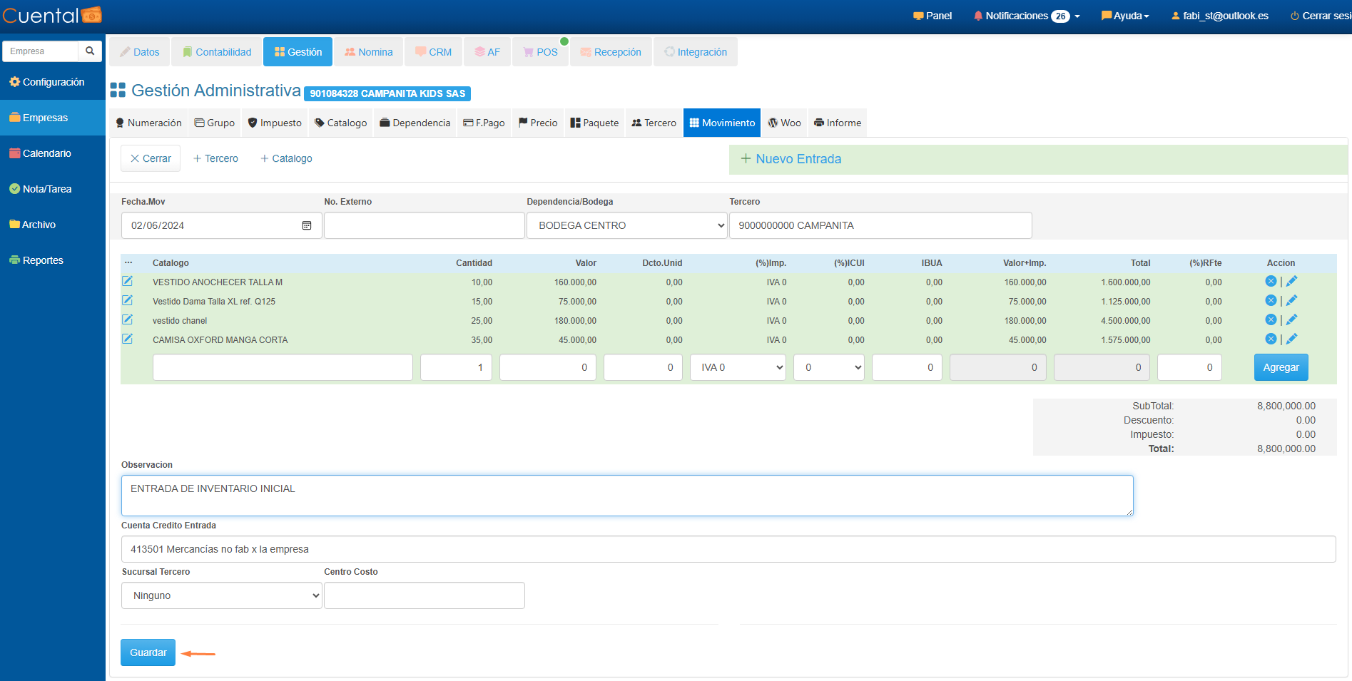 ✓ Recuerda que para el caso de Entrada de Inventario inicial, el valor total del comprobante sea igual a lo que se registra de inventarios en los saldos iniciales.