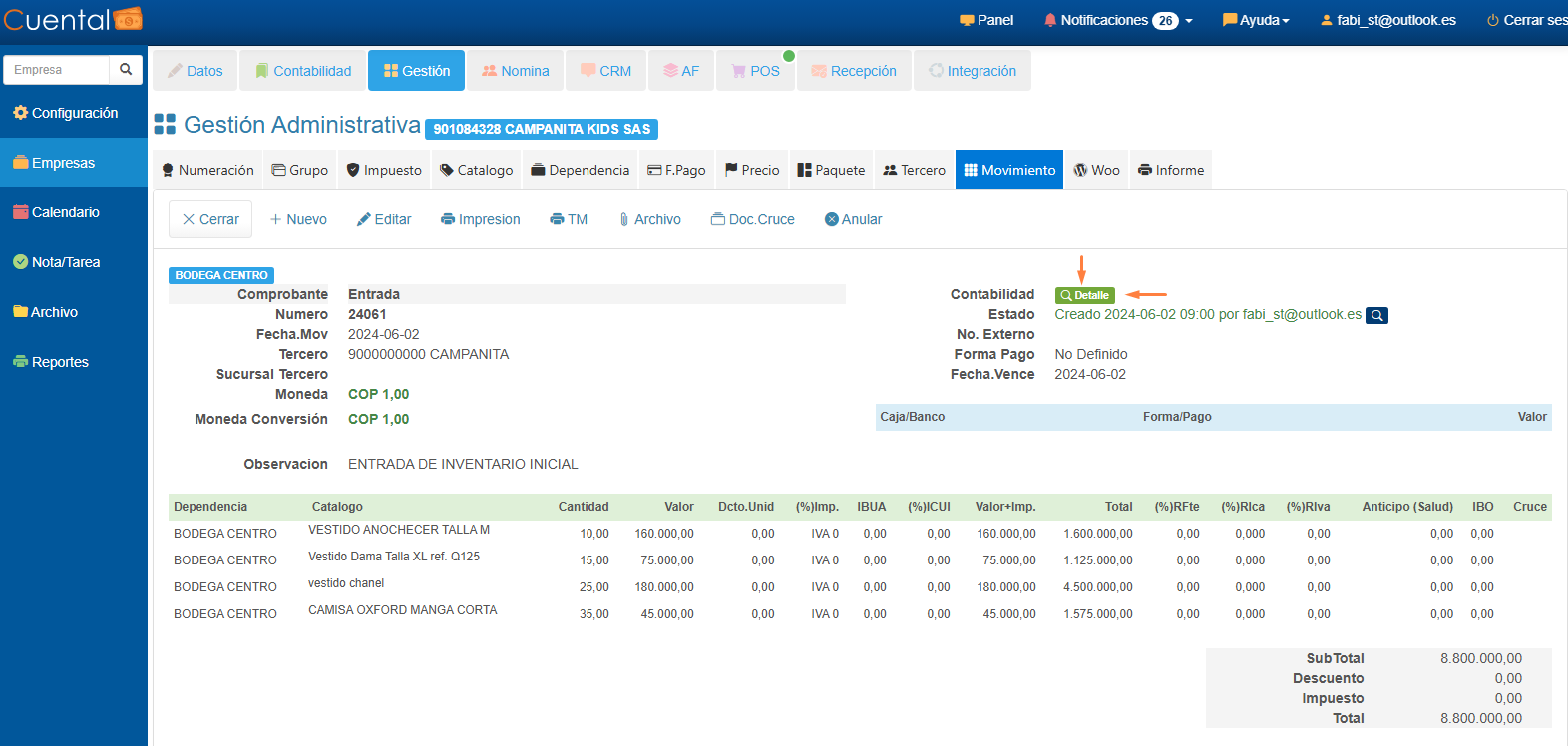 Para visualizar el detalle de la contabilización del movimiento haz clic en el botón Detalle