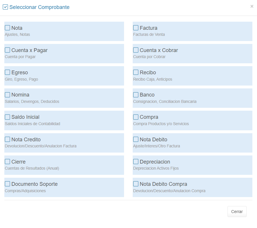 2. En la sección Movimiento, haz clic en el botón + Crear Nuevo y seleccione el comprobante que desea generar.