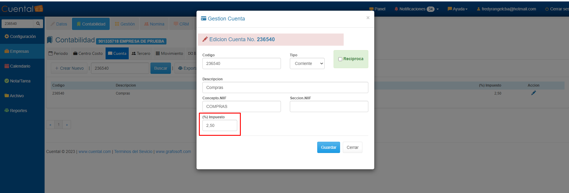 ✓ Para que el cálculo de la retención sea automático en contabilidad, incluya la tarifa en la respectiva cuenta contable. Ver aquí