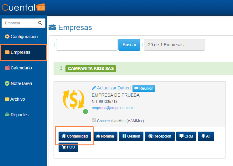 1. Ingresa a menú Empresa y haz clic en el botón o módulo Contabilidad.