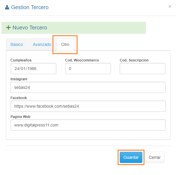 6. Sí deseas incluir Datos adicionales como ok.Fecha de Cumpleaños, Código Woocommerce, Código Suscripción, Instagram, Facebook y/o Página We, haz clic en la pestaña Otro, diligencia los datos que quieras registrar y haz clic en el botón Guardar.