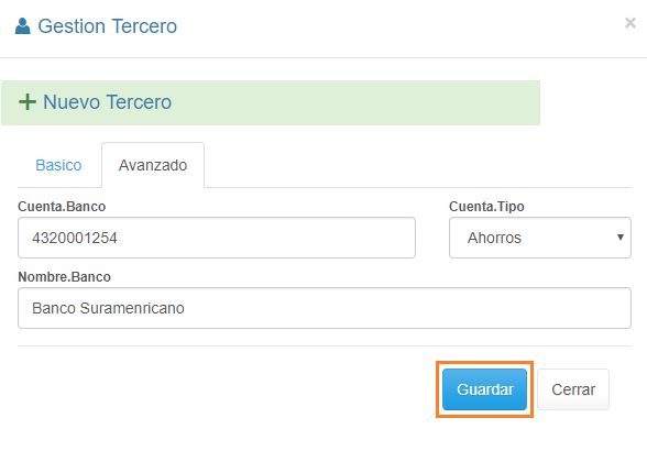 4. Para diligenciar cuenta Bancaria al Tercero, haz clic la pestaña avanzado.