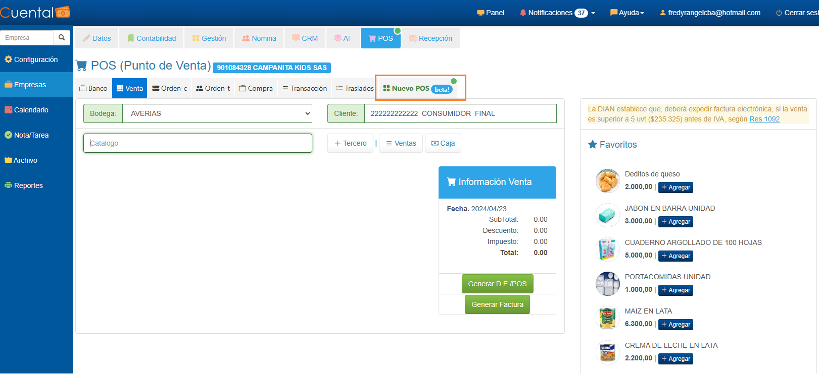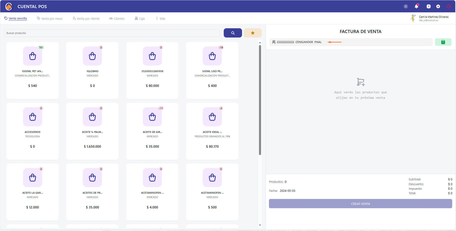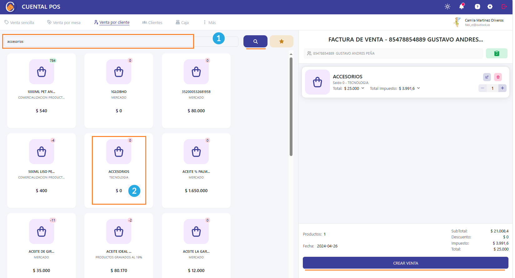 1. Haz clic en menú Empresas y selecciona el botón POS. 2. Haz clic en la pestaña Nuevo Pos Beta. 3. Haz clic en el botón Comenzar 4. Haz clic en la opción Venta Sencilla y haz dentro en el campo señalado en la imagen para agregar el tercero. 5. Realiza la búsqueda y selección del Cliente digitando su nombre y presiona la tecla enter. 6. Haz clic en el botón. 7. Agrega los productos de la compra según tu forma de preferencia.