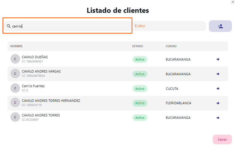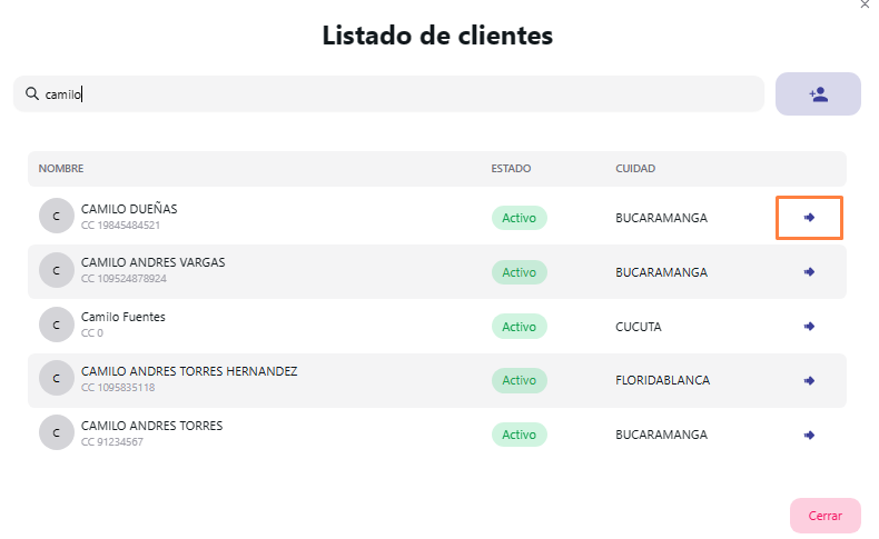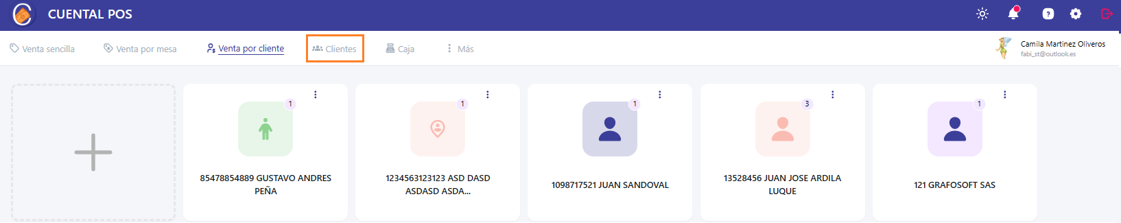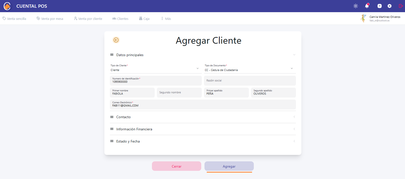 En el módulo Clientes haz uso del botón "+" para crear clientes. Activa el botón Agrega los datos básicos (número de documento, nombre o razón social, correo electrónico) en el formulario y finalizar haz clic en el botón Agregar. |