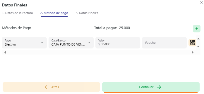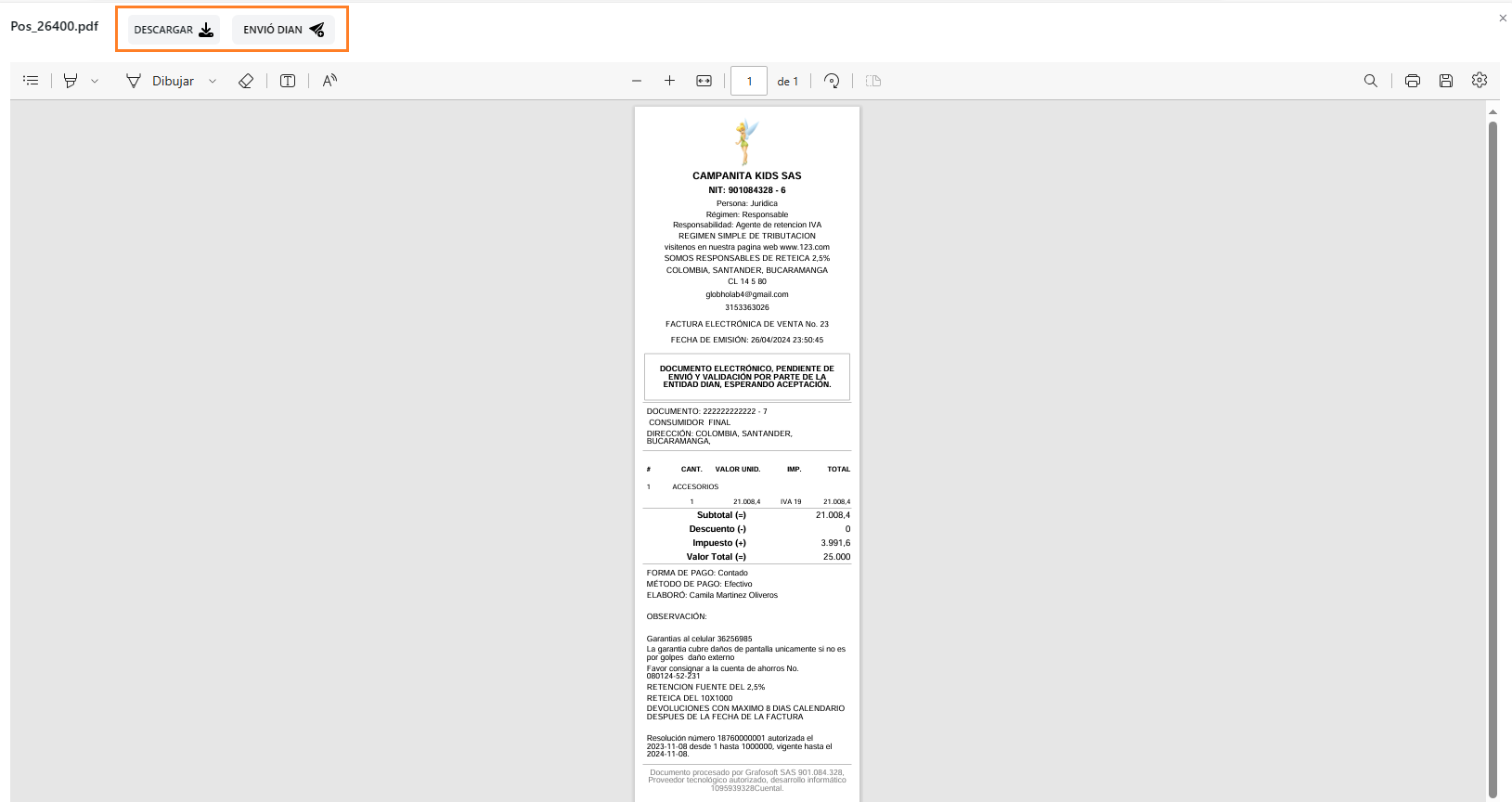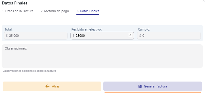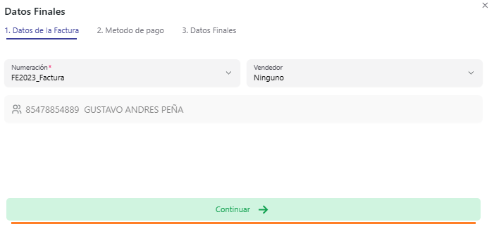 8. Haz clic en el botón Crear Venta. 9. Selecciona Numeración (FEV, Doc.Equivalente POS), agrega un vendedor (opcional), realiza la búsqueda y selección del tercero y haz clic en Continuar. 10. Agrega datos a cerca del método de pago y haz clic en Continuar. 11. Agrega datos finales como Recibido en efectivo, observaciones y haz clic en Generar D.E/POS o Factura según el tipo de Numeración que hayas seleccionado en los Datos de la factura. 12. Haz clic en los botones DESCARGAR O ENVÍO DIAN para activar la función respectivamente. |